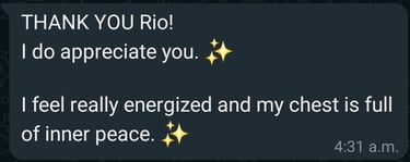 "Rio’s intuitive guidance transformed my journey from overthinking to healing, empowering me to connect deeply with myself, embrace my gifts, and confidently run my own psychic reading practice."